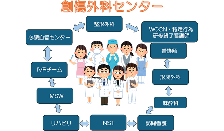 当院では外傷および糖尿病性足病変・下肢虚血や熱傷・褥瘡・下肢潰瘍など出来るだけ多くの疾患に対処します。専門科や各サポートチームとの他職種連携を行い患者様の状態に合わせた医療を提供し、必要に応じて外科的改善を図ってまいります。