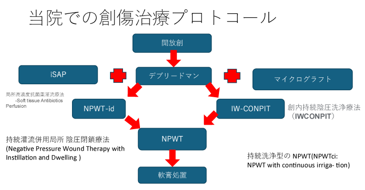 - 当院では交通外傷などをはじめとしできるだけ早期より外傷に早期に介入します。局所陰圧閉鎖療法をはじめとし早期治癒を目指します。